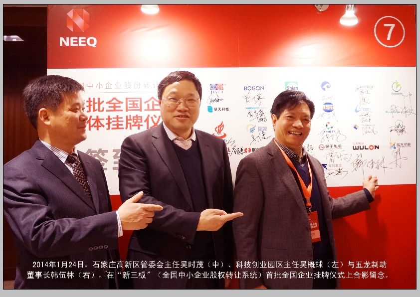 在市政府與高新區(qū)工委、管委領(lǐng)導的幫助支持下,五龍公司自2010年開始籌備“新三板”掛牌工作,2010年10月完成股改,經(jīng)過三年不懈努力,五龍制動成功掛牌。2014年1月24日掛牌儀式標志著五龍制動公司正式在全國首批中小企業(yè)股轉(zhuǎn)系統(tǒng)掛牌,股票簡稱:五龍制動,股票代碼:430540。五龍制動公司成為新三板擴容后的全國首批二百余家掛牌企業(yè)之一,也成為河北省三家掛牌企業(yè)之一,也是石家莊市首家“新三板”掛牌企業(yè)。這意味著五龍公司迎來了一個新的歷史發(fā)展機遇,五龍公司在公司發(fā)展史上樹立了一個新的里程碑。