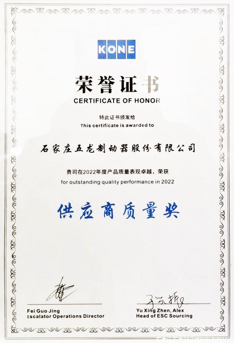 五龍制動在通力電梯舉行的供應(yīng)商大會上,榮獲了2022年度"供應(yīng)商質(zhì)量獎",這是通力電梯對每年做出突出貢獻(xiàn)、表現(xiàn)出色的供應(yīng)商特有的表彰。