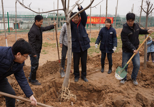 活動(dòng)開始前,董事長(zhǎng)韓董號(hào)召全體員工積極投入到建設(shè)綠色生態(tài)新廠區(qū)活動(dòng)中,共同努力實(shí)現(xiàn)“采菊東籬下,悠然見南山”的廠區(qū)美景??偨?jīng)理陳總具體安排了植樹任務(wù),接著請(qǐng)植樹專家賈師傅給大家具體講解了植樹的注意事項(xiàng)。很快開始了植樹活動(dòng),整個(gè)過程中,每個(gè)人都積極參與,有挖土的、有植樹苗的、有填土,相互配合,大家干勁十足,熱火朝天,不到一個(gè)小時(shí)的時(shí)間,一棵棵樹苗就直立起來。雖然植樹有點(diǎn)累,但在大家的臉上看到的更多是喜悅,充分享受著植樹活動(dòng)帶來的樂趣和成就感。